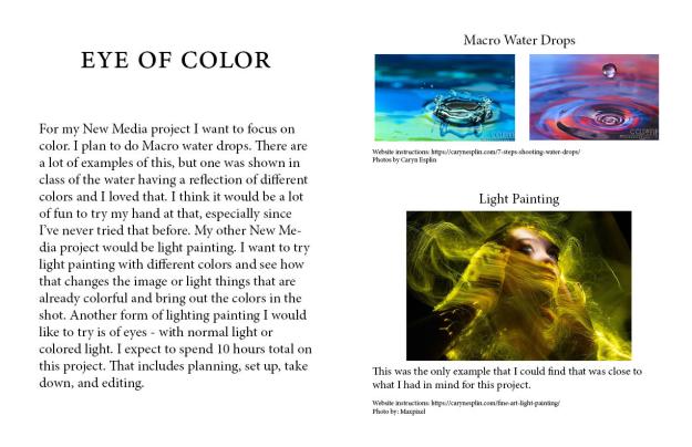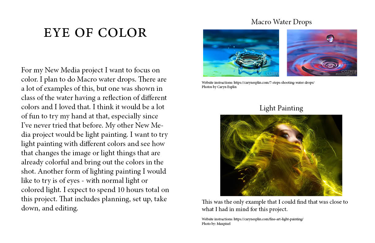 For my final New Media Project I chose to do Light Painting and Macro Water Drops. I chose these two because I wanted to expand on my understanding of Light Painting by myself and figure out how to set up a display. I wanted to work on Macro Water Drops because I thought the example shots looked amazing and I wanted to work out how to do that.